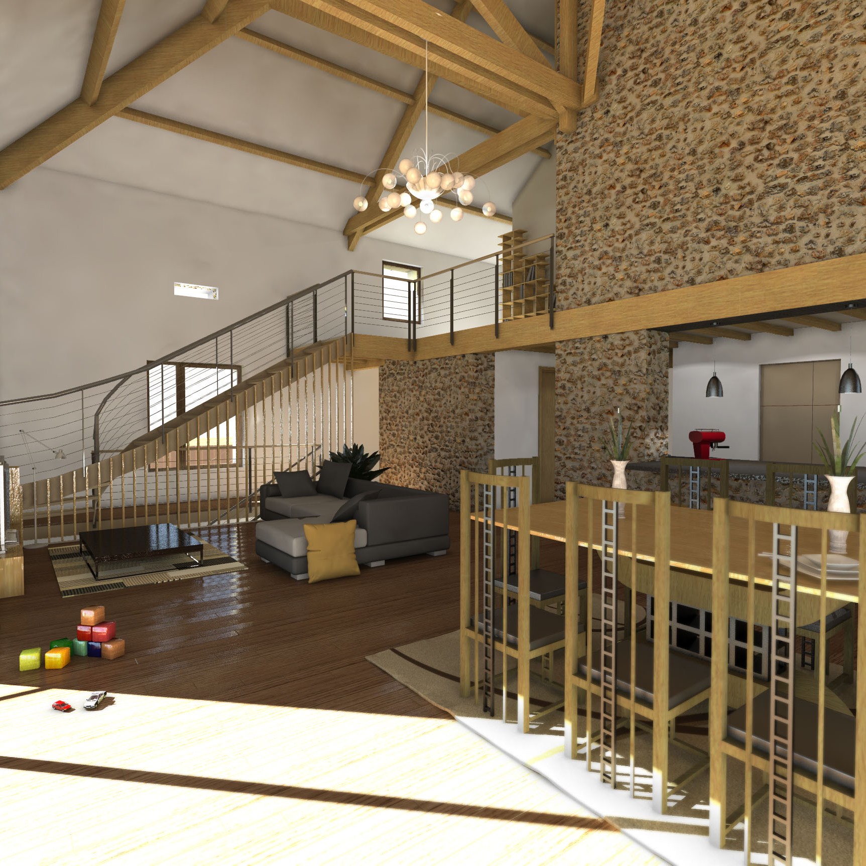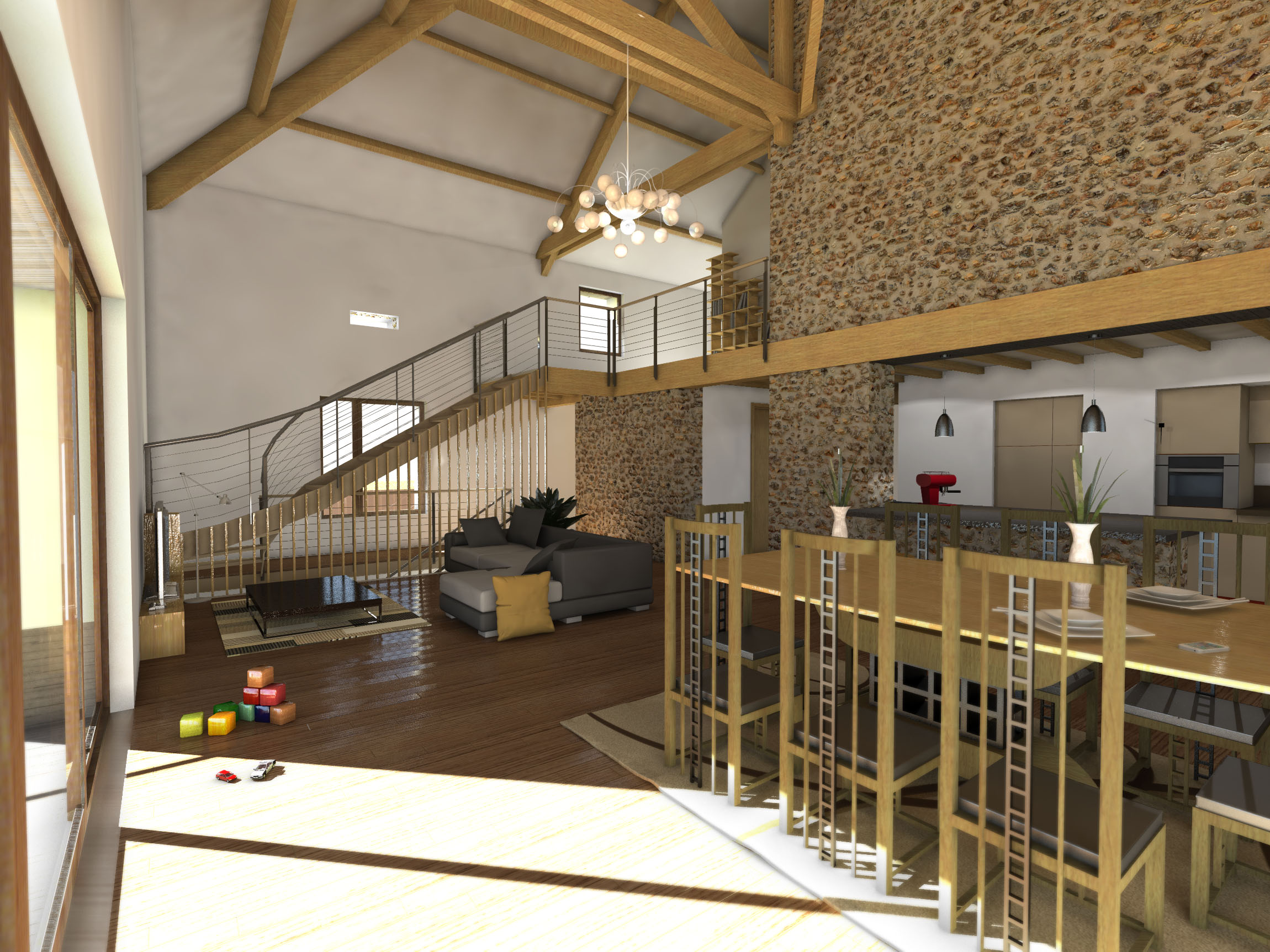 Une structure intérieure est ajoutée afin de supporter les nouveaux planchers en bois, l’isolation est réalisée par l’extérieur sur la partie habitable ce qui permet de conserver la pierre en finition intérieure, tandis que le soubassement est laissé en pierres apparentes. Les volumes existants, conséquents, sont conservés au maximum afin de créer des pièces lumineuses, alliant les matériaux anciens et des éléments de design plus contemporains.