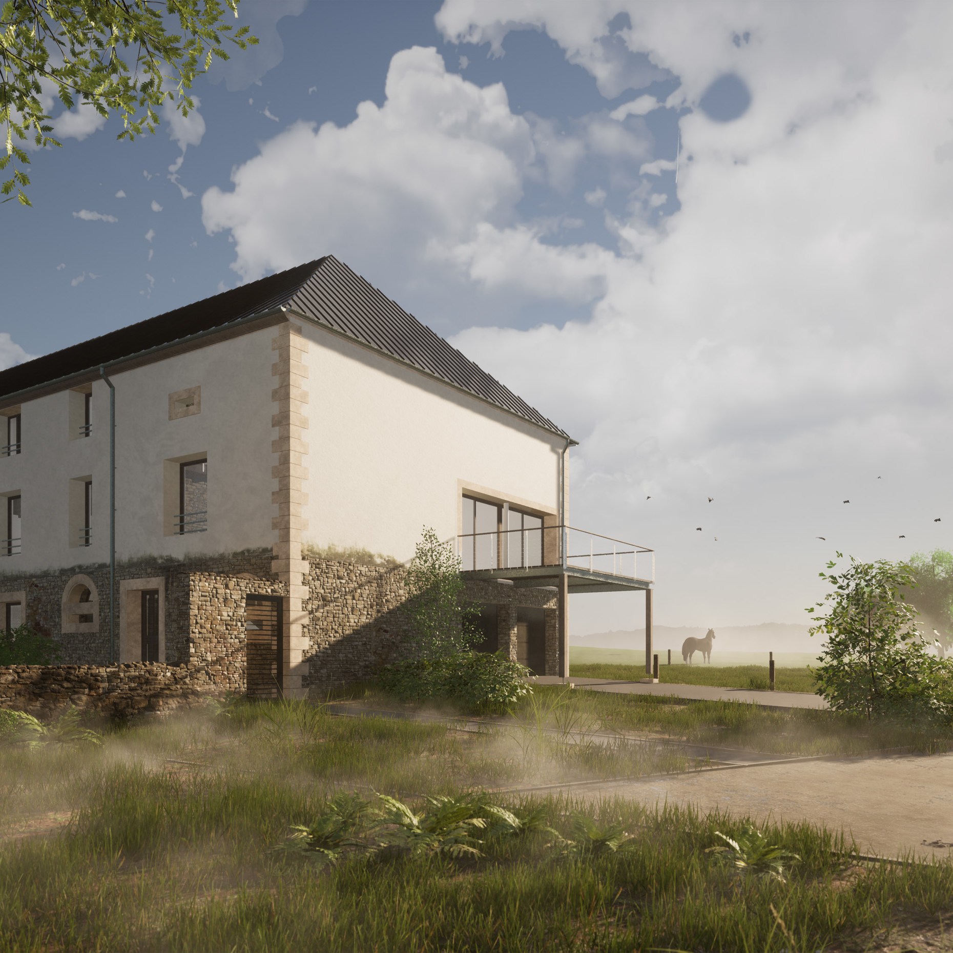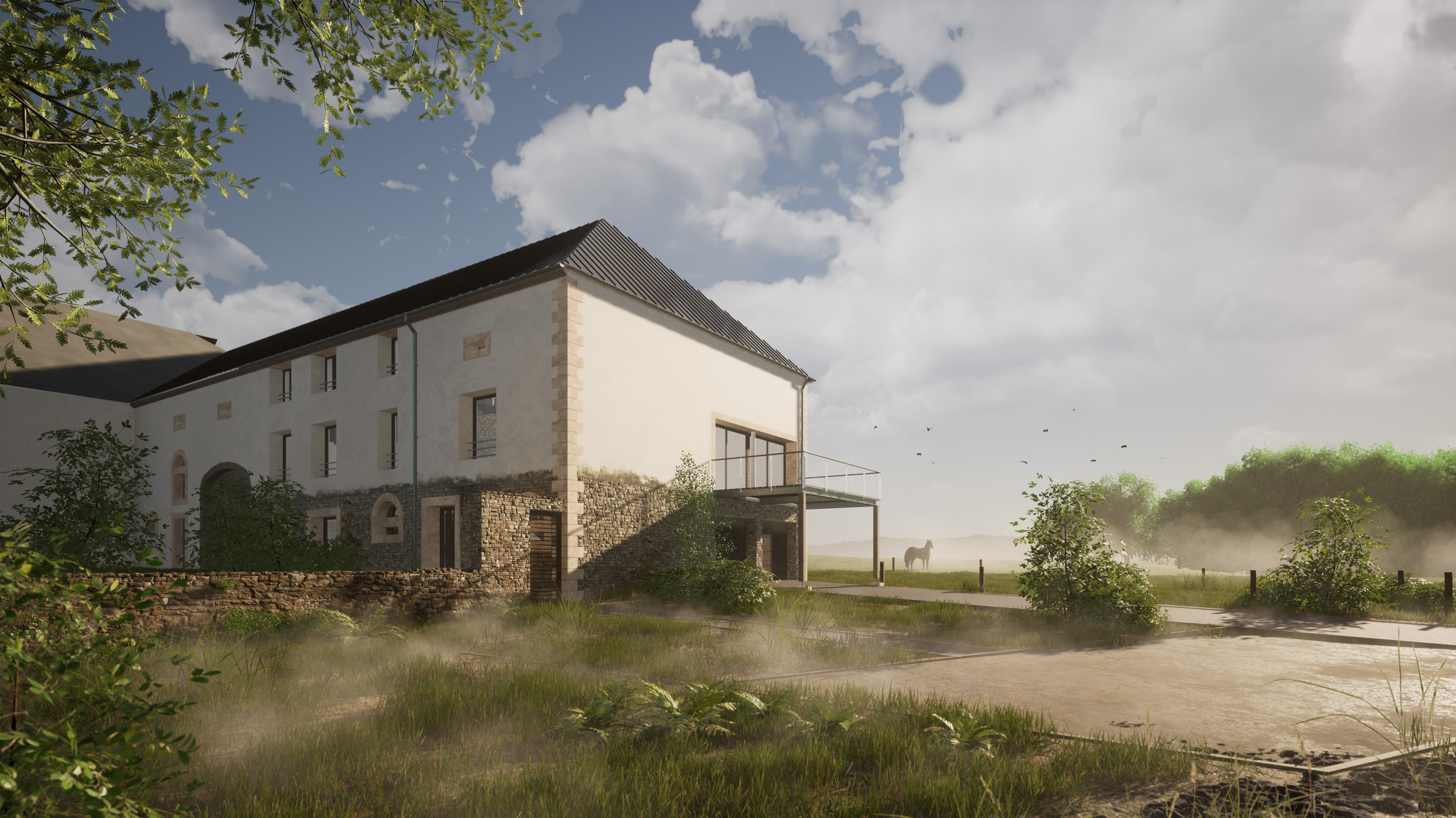 La ferme du bois le Kleis est un ancien hameau isolé, aujourd’hui propriété d’une seule famille. Le projet consiste en la réhabilitation de l’une des granges en vue de créer une maison d’habitation pour un jeune couple. Le contexte est atypique puisque le bâtiment est complètement isolé de la ville et doit donc être autonome en eau et en assainissement.