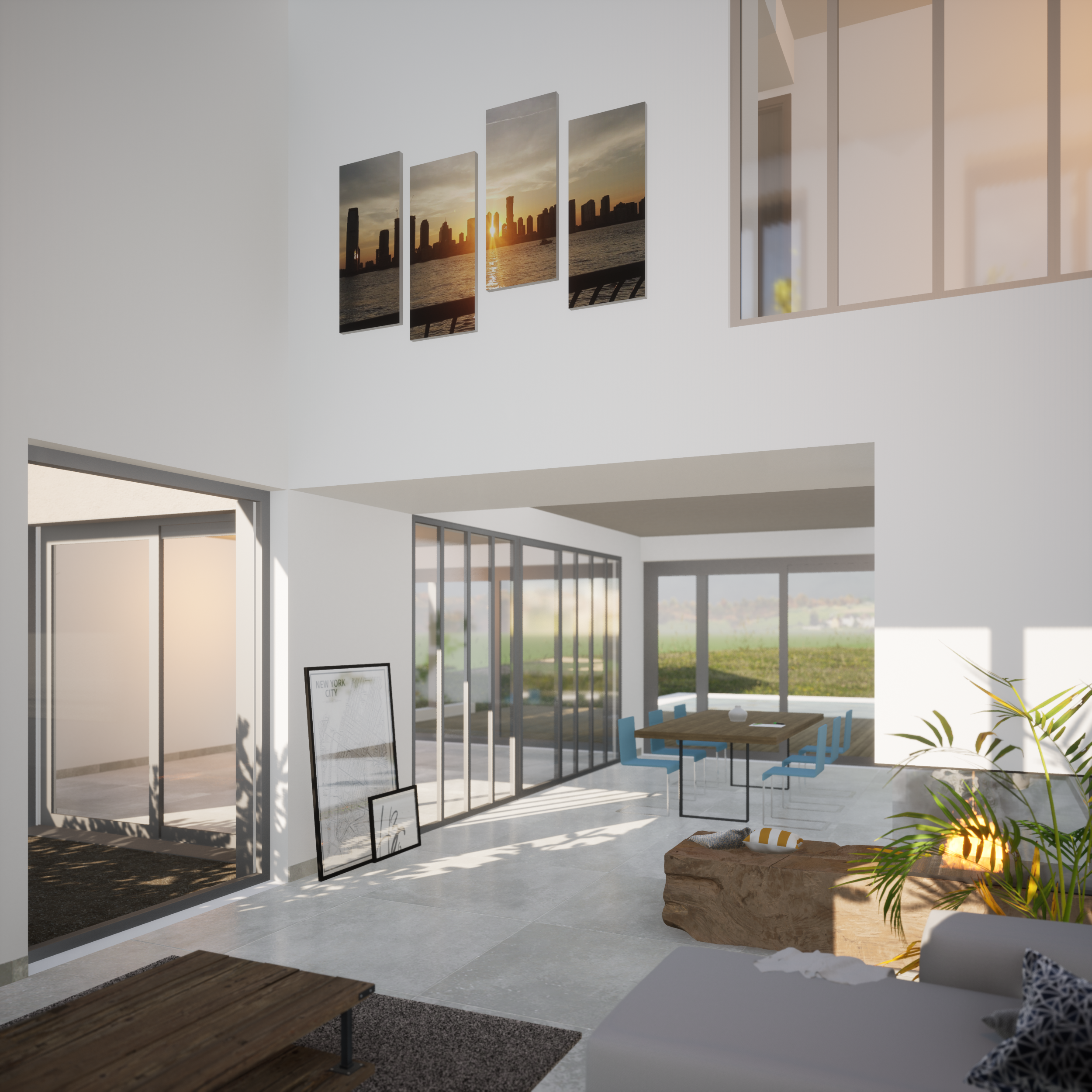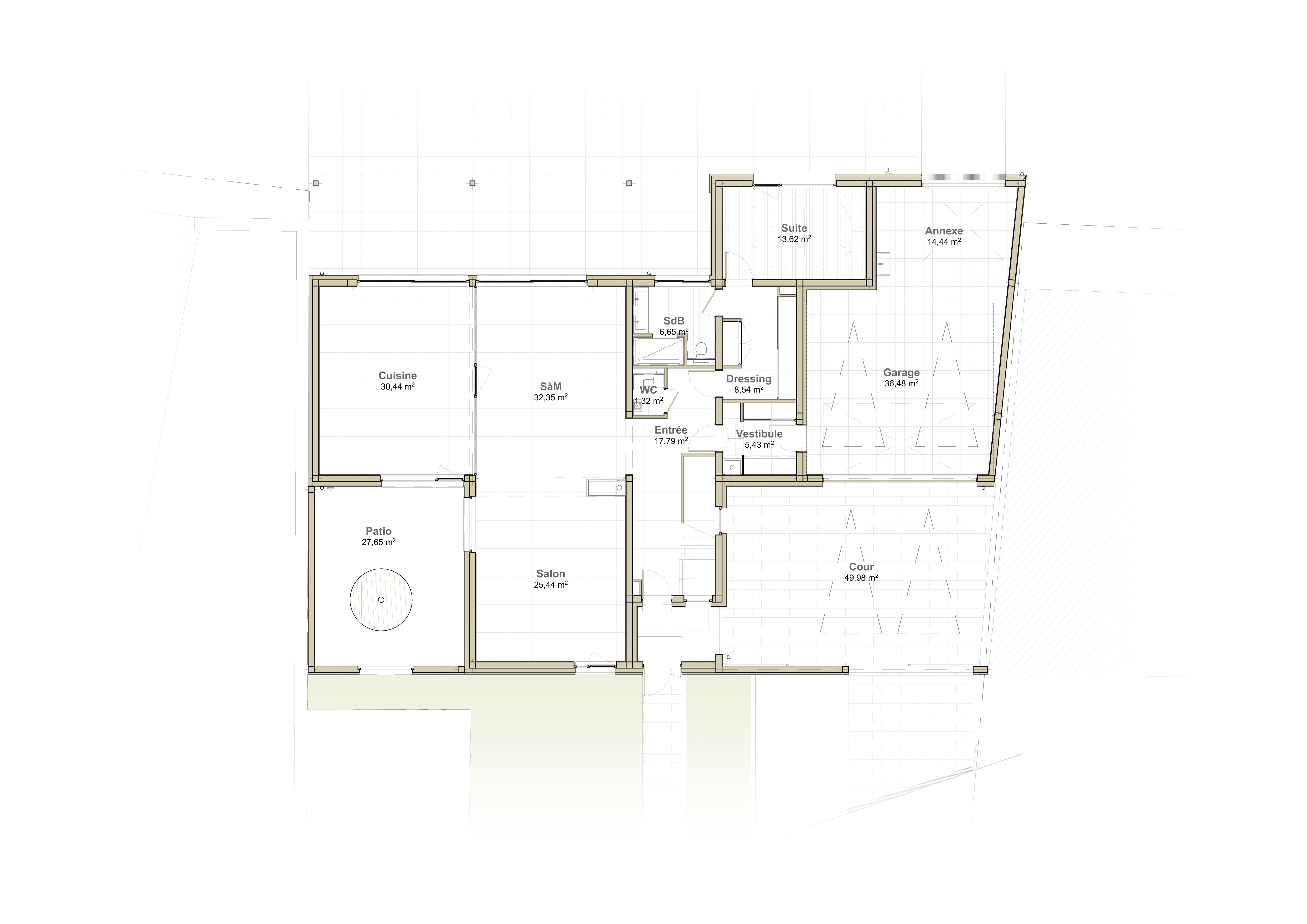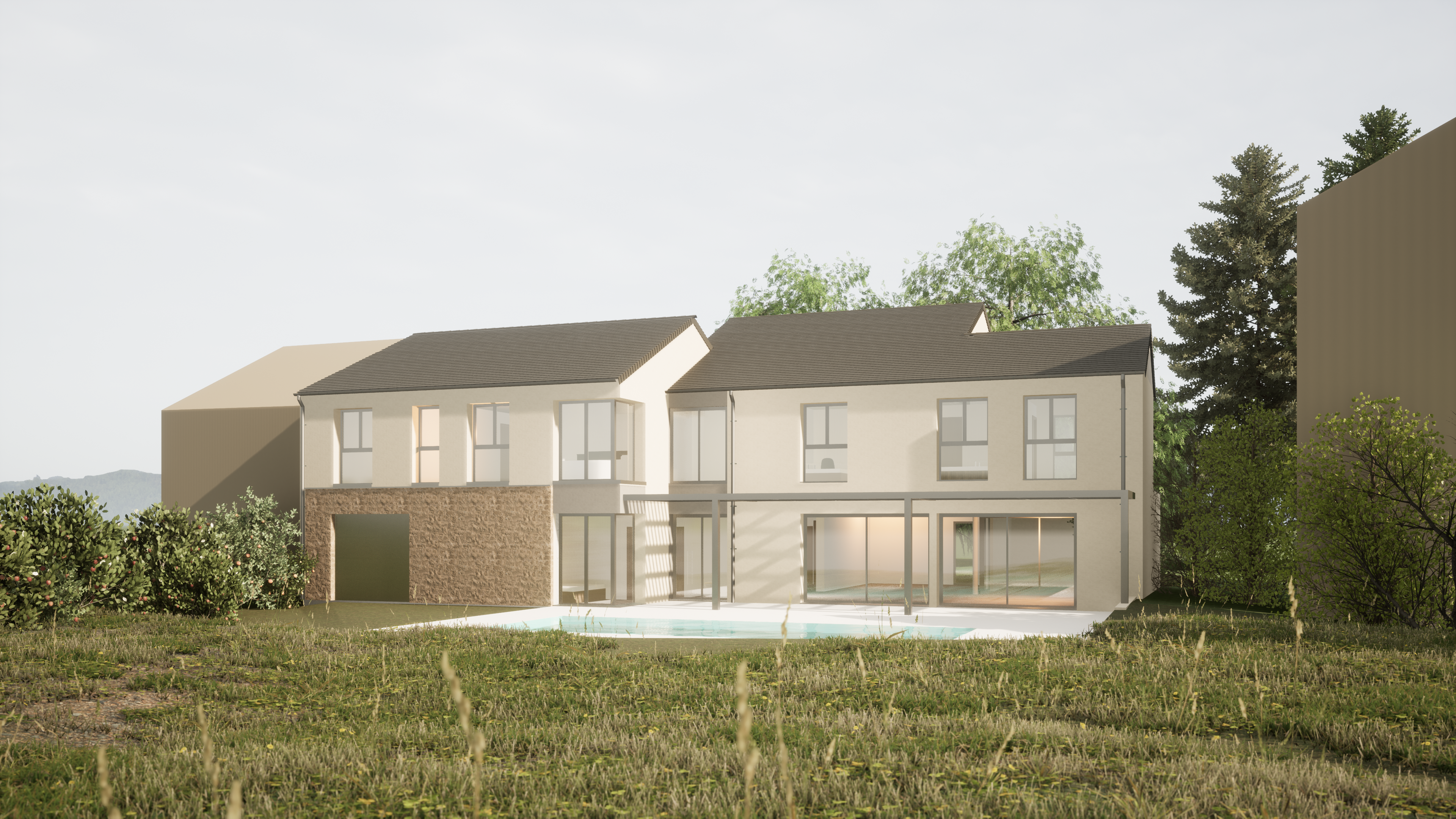 Un mur de clôture en façade sur rue, imposé par le règlement d’urbanisme, est ici devenu un élément de projet qui permet de mettre à distance l’habitation avec le milieu urbain. Cet élément opaque permet de créer des espaces de vies extérieurs complémentaires à l’habitation. La façade arrière est, elle, très largement ouverte sur le paysage.
