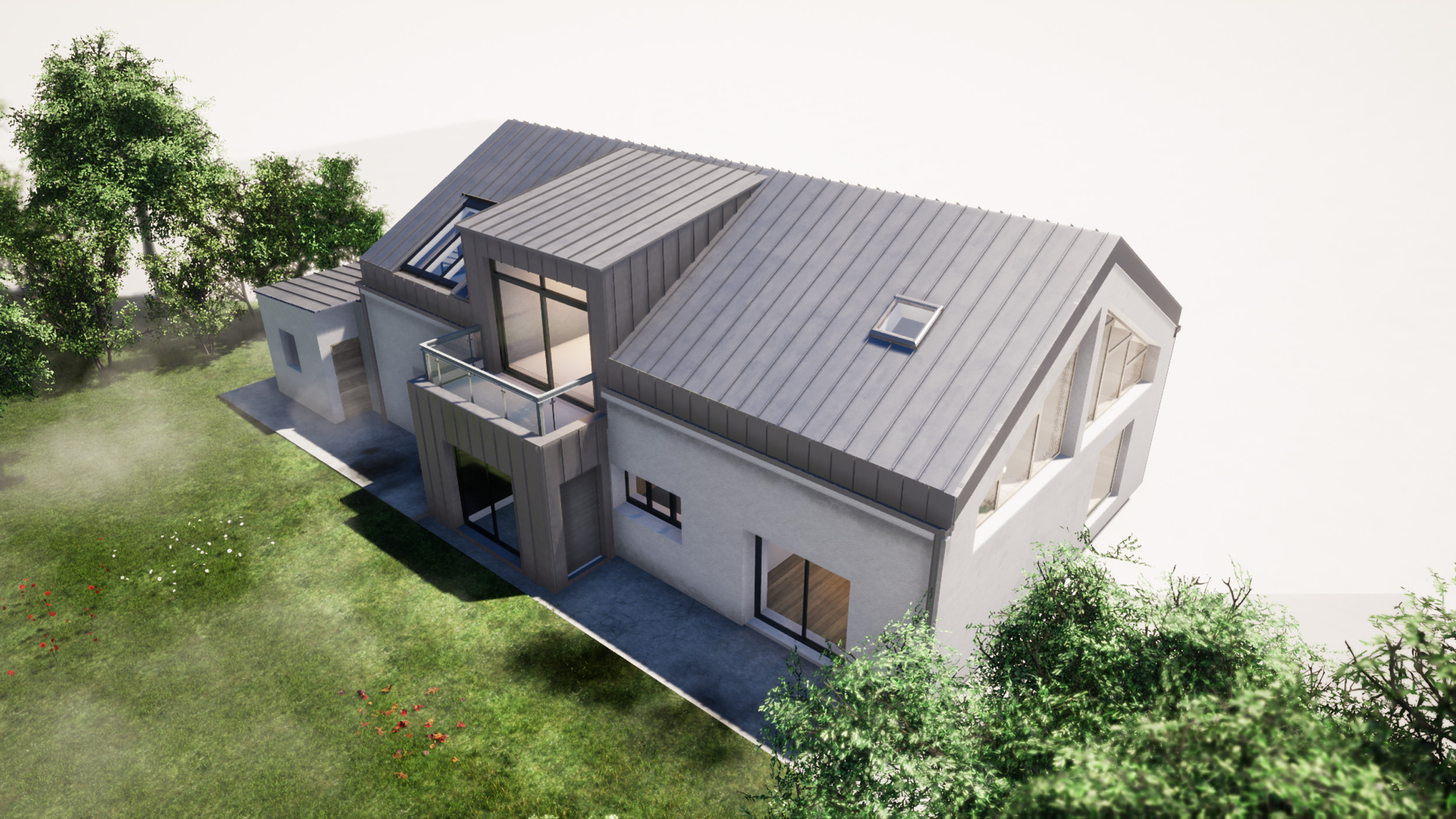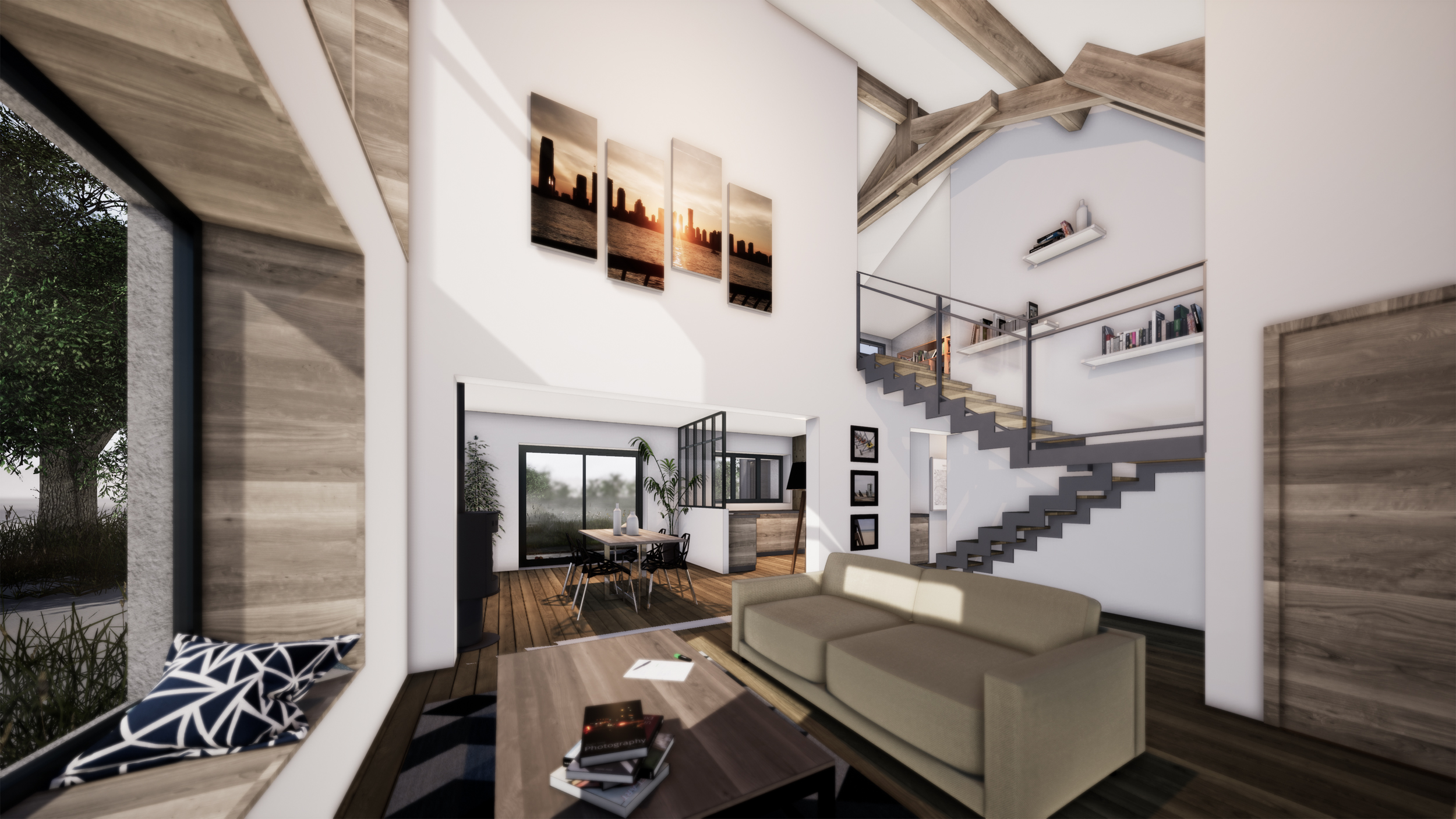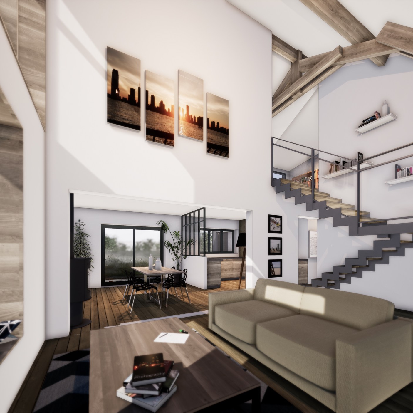 Nous avons travaillé ensemble pour recréer des espaces intérieurs lumineux, en supprimant notamment une partie du plancher des combles pour créer une double hauteur dans le salon. La toiture a été remaniée pour augmenter les volumes disponibles et créer une ouverture vers le jardin et le paysage.