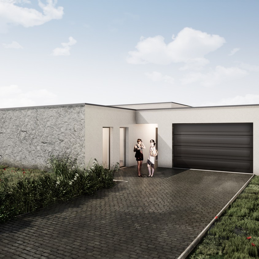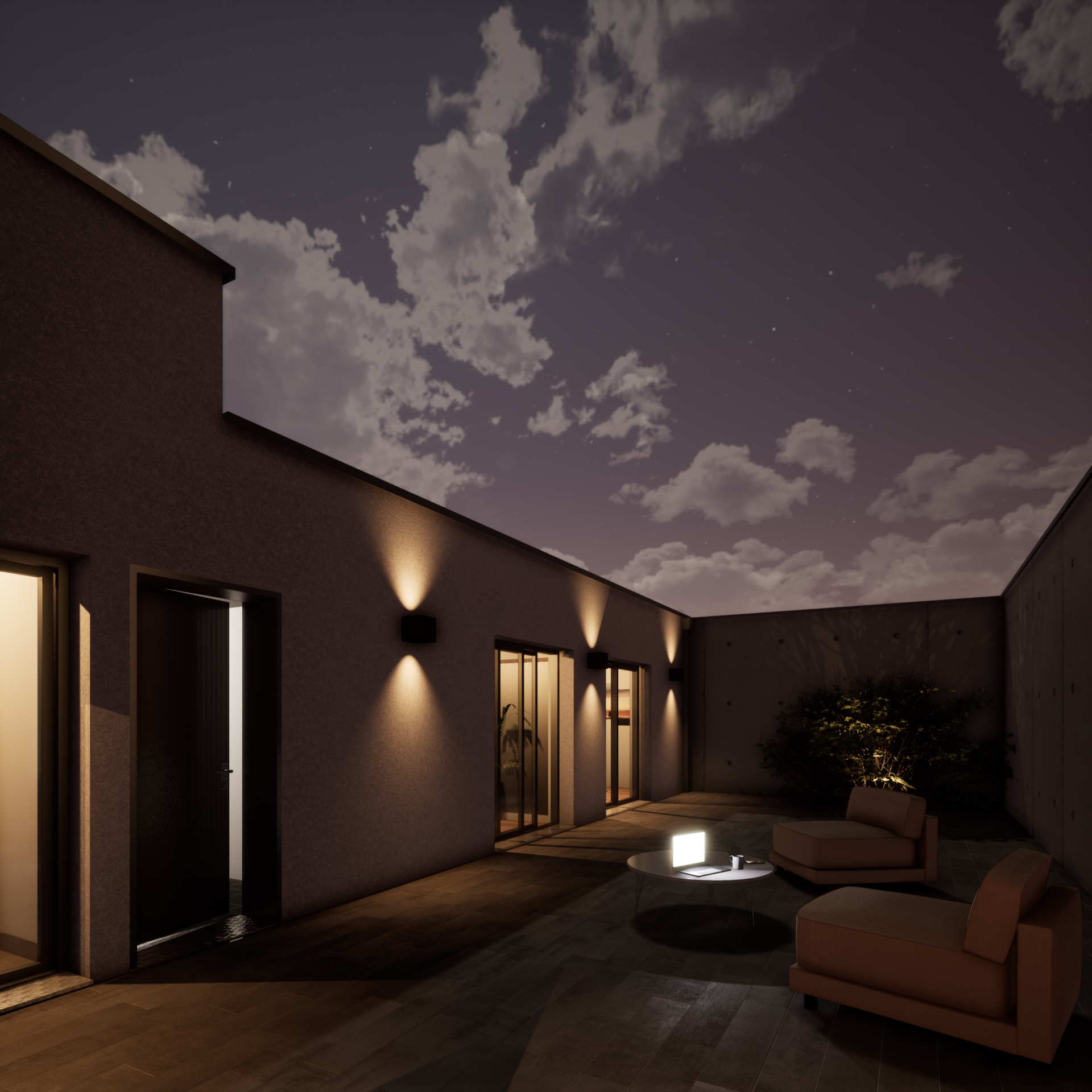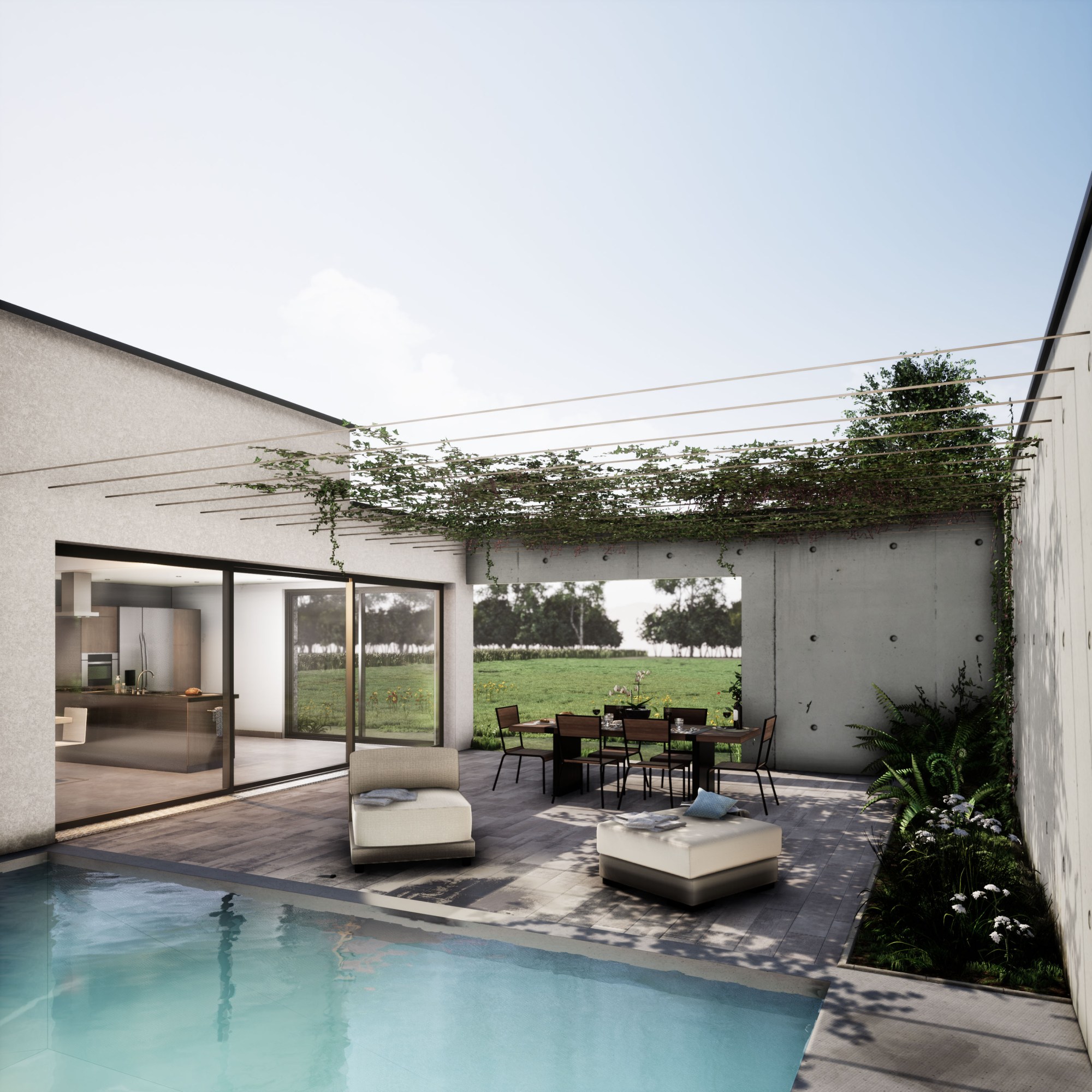 Ce projet assez spécial a pu voir le jour grâce à l’implication d’un maître d’ouvrage sensible à l’architecture contemporaine, qui a souhaité pour sa maison un design épuré inspiré par l’Architecte espagnol Alberto Campo Baeza. En effet, le bâtiment en béton est fermé sur lui-même, l’extérieur est austère, mais en réalité le foyer s’articule autour de deux patios qui, en plus d’être des pièces de vie à part entière, abritées des vents, éclairent l’ensemble des espaces intérieurs.